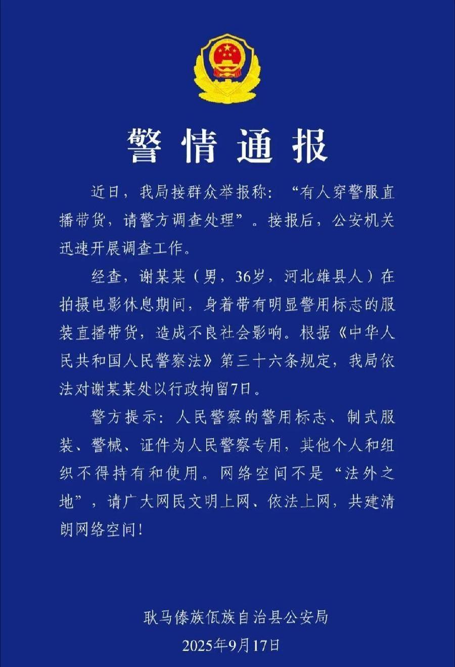 9月17日晚,云南耿马傣族佤族自治县公安局通报:经查,谢某某(男,36岁,河北雄县人)在拍摄电影休息期间,身着带有明显警用标志的服装直播带货,造成不良社会影响。根据《中华人民共和国人民警察法》第三十六条规定,依法对谢某某处以行政拘留7日。